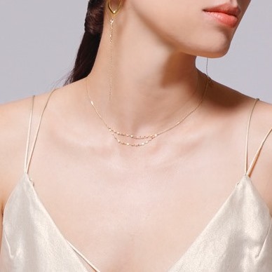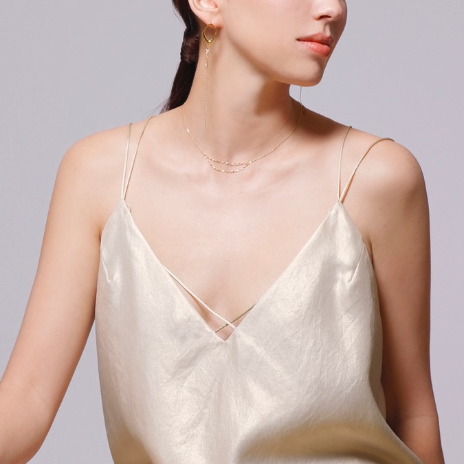 「微笑み」と名付けられた、知的でフェミニンな華やかさを演出してくれるネックレス。身体のシルエットに沿って流れるような曲線を描く、2つの異なる繊細な美しいカットのチェーンが特徴的。